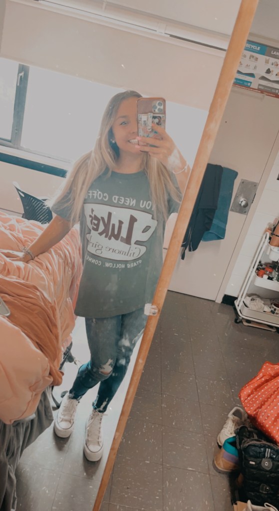- Luke’s Diner T-Shirt https://www.target.com/p/women-s-gilmore-girls-luke-s-short-sleeve-graphic-t-shirt-green/-/A-84648380?preselect=84151294#lnk=sametab